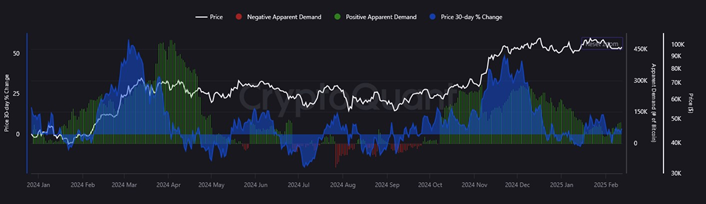 Data from January to early February 2025 indicates apparent Bitcoin demand dropped from 207,964 BTC on Jan. 1 to 33,587 BTC by Jan. 31 before recovering above 50,000 BTC in early February and exceeding 100,000 BTC by mid-month.