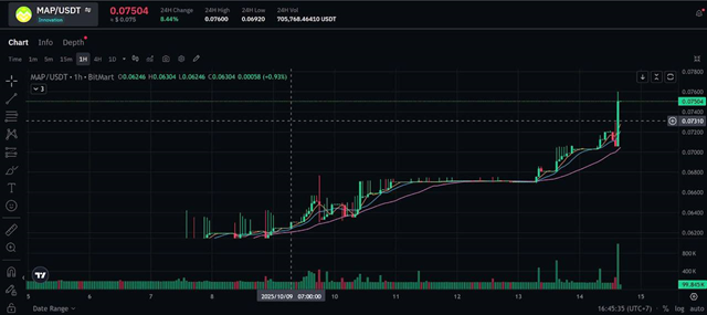 Over the past 24 hours, MAP/USDT has staged a remarkable rally, breaking above the 0.075 USDT resistance with an impressive 8.44% surge — confirming a powerful bullish momentum and growing investor confidence.